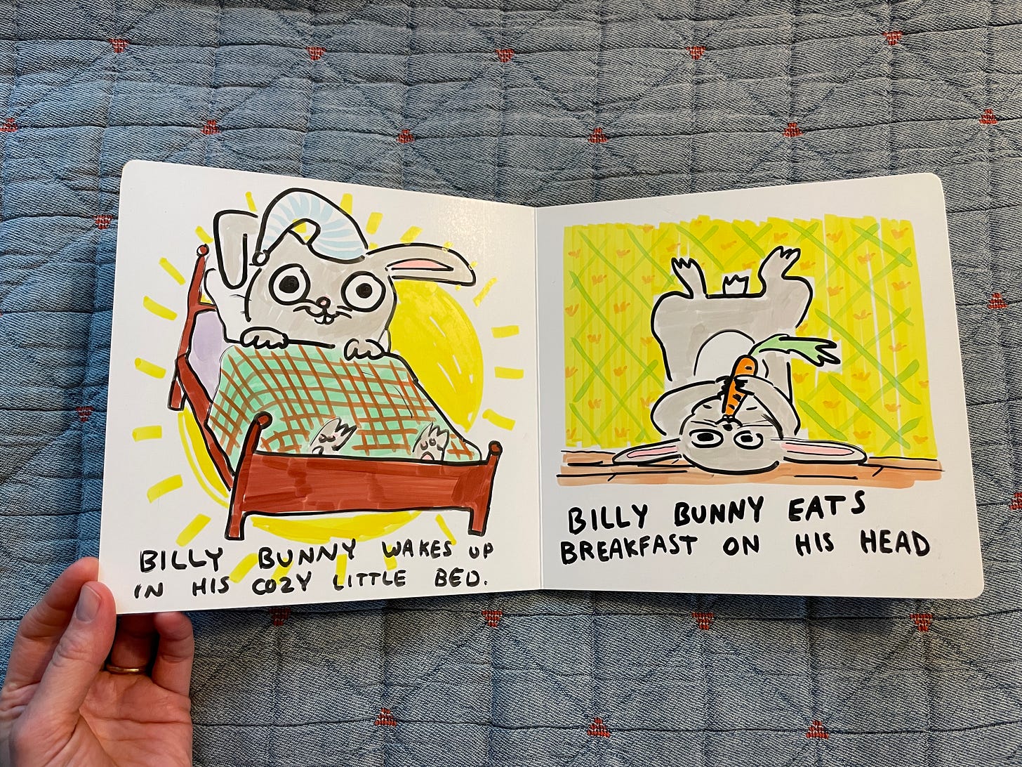 Anyway, while I was perusing their site, I discovered they sell blank books, including board books! I immediately ordered one and made Billy Bunny, which is, you guessed it, about a Bunny named Billy. I love a blank book! So official. Order a couple and turn it into a fun bonding activity: letās make board books! Itās nice that they cost like two dollars so you can just go crazy and not be too precious about it. Consider combining with a gift of COPIC markers which I can confirm work well on the board book surface.